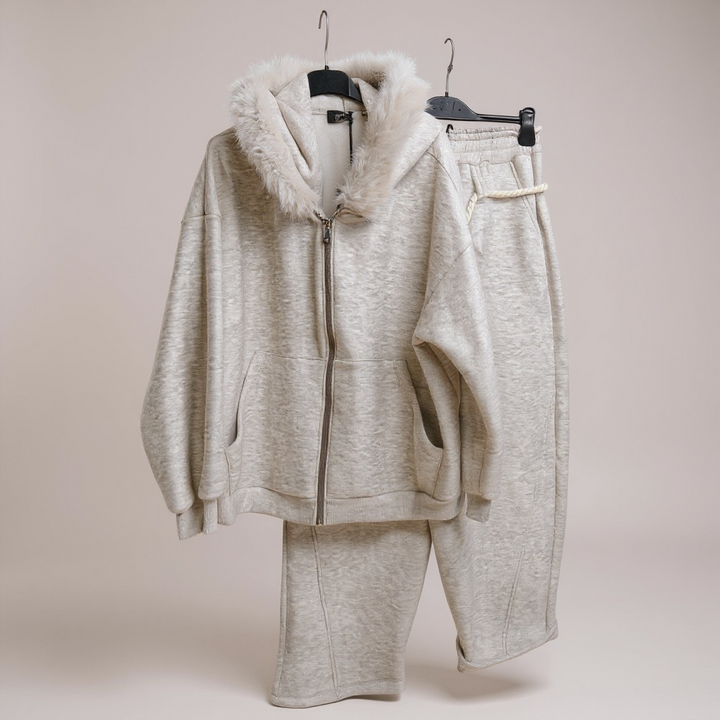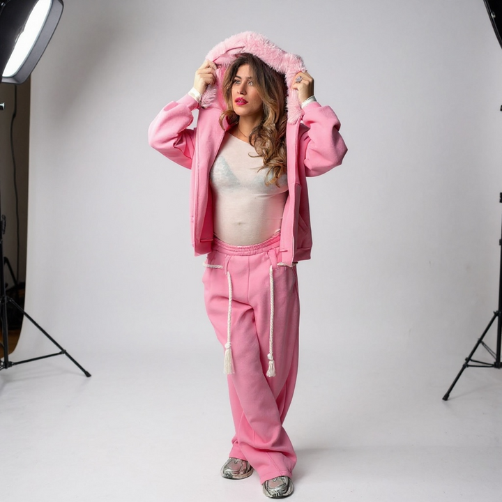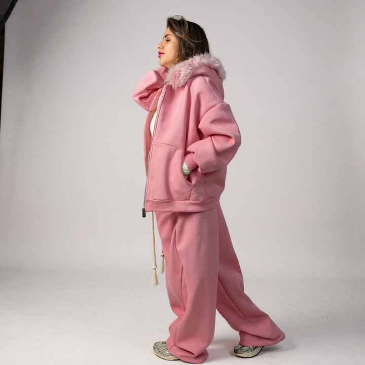 - Descrizione: taglia unica modello over felpa con cappuccio e eco pelliccia pantaloni modello balloon tessuto con pile interno Grazia è alta 1,66cmt x 57kg al sesto mese di gravidanza