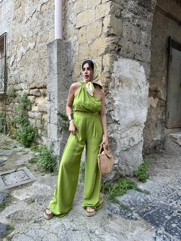 - Descrizione: taglia unica elastico in vita modello a palazzo monospalla con cinturino regolabile la modella è alta 1,66