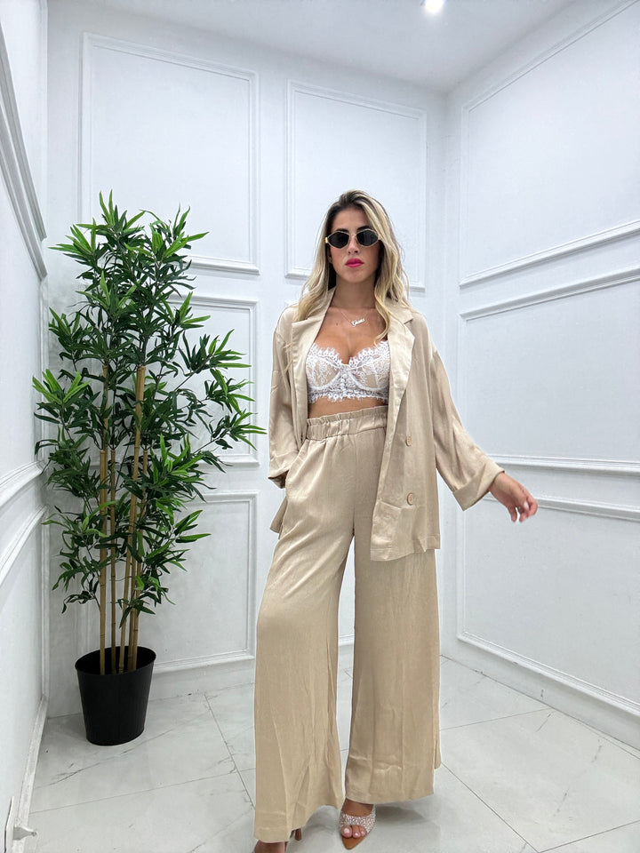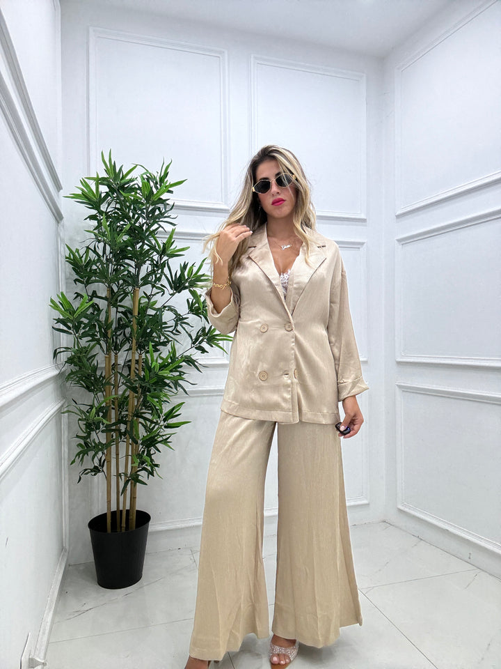- Descrizione: doppio petto maniche a 3/4 pantaloni con elastico in vita modello largo a palazzo tessuto molto particolare ottima manifattura Grazia è alta 1,66 ed indossa la taglia S